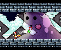 These battles, and others like them, set the tone of the game as a whole. Yoshi's Island encourages experimentation in strategy on the part of the player by continually subverting the player's expectations of what will be required of them in a Mario game. The game is only able to make this design work because it adopts the sprite-deformation techniques enabled by the Super FX 2 and perhaps informed by the burgeoning 3D game design industry. In this sense, Yoshi's Island is the first truly modern Mario game in game design sense, as it, for the first time, has full control of its graphical assets and can deploy them against its themes. The small segments inform the whole, exploring the mechanics in greater and more experimental depth that had been achieved before.